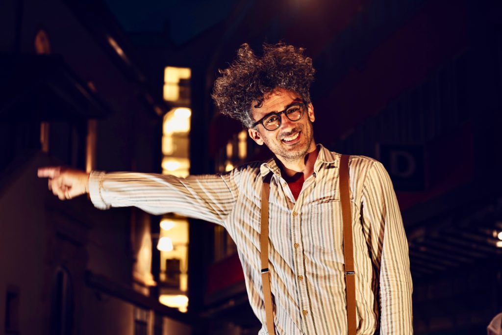 Il jongle habilement avec les manches de son “Guitanjo” une guitare-banjo de sa création, un vieux trombone rafistolé, une kalimba greffée sur un réveil, une batterie de casseroles tintinnabulantes, et une série d’objets devenus instruments… Le tout orchestré par une pédale enregistreuse et des boîtes en fer remplies d’astuces électroniques.