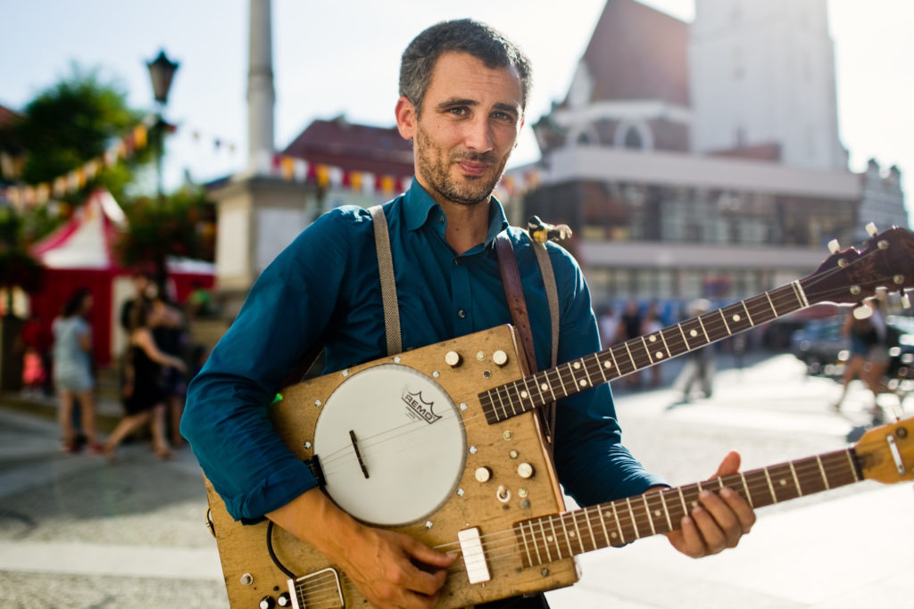 Eric Tarantola plays his extraordinary instruments: a sauce pan drum set, an old patched trombone, the “Clock Thumb Piano” and the “Guitanjo” combining a guitar and a banjo. All these instruments are masterfully blended by loop machine and fx pedal to create audio magic.